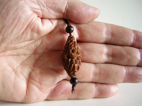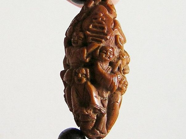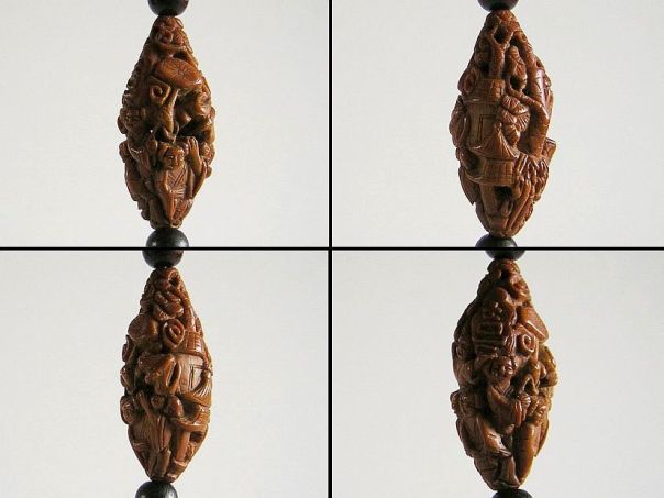 Exceptional miniature carving made from the kernel of a ‘gânlan’ fruit which is a rather hard material. Even though the carving depicts four boys, we believe that two of them are the 'Heavenly Twins' (Hehe Erxian) because one has a box in front of him and the second one holds a lotus stem in his hands. Another boy raises a ‘Ruyi’ scepter which stands for ‘ Everything you wish for will be granted’ and the fourth boy carries a sign with the character Xi (喜) or Happiness in one hand and a Gourd (Blessings & Fertility) in the other. An upside down Bat represents the saying ‘Blessings have arrived’ and Clouds symbolize the ‘Granting of all wishes’. The boys dwell in a landscape with Houses (Good Fortune & Harmony with Nature), a Pine Tree (Longevity) and Bamboo (Humility & Fidelity). All in all, this small object is full of symbolism. It was hand-carved in the latter part of the 20th century but is not signed which is normal for that period. Length 3.6 cm. Diameter 1.6 cm.